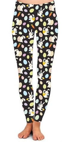Some bunny is eggcited for Easter! These super cute, dark charcoal grey background leggings have the bunny running around for an egg hunt!