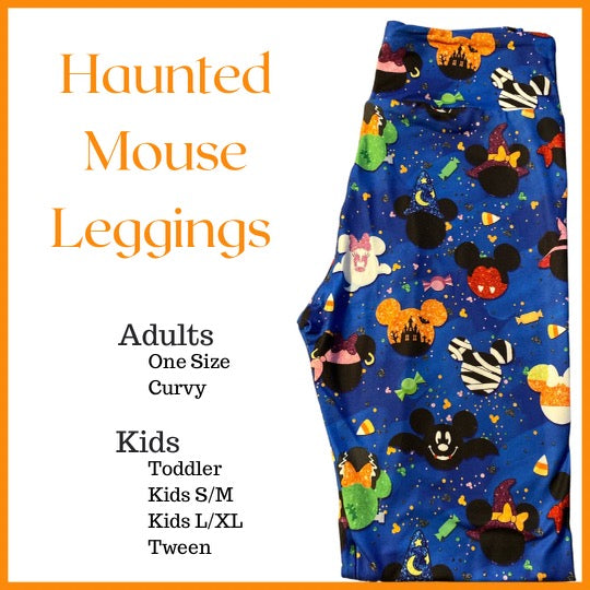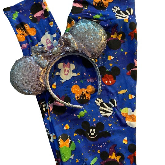 Get ready for Halloween in these super soft, brushed blue background Mouse Ears Halloween leggings! Buttery soft 92/8 brushed poly spandex blend. Pick up a pair for you or your little and wear as a mommy and me set!