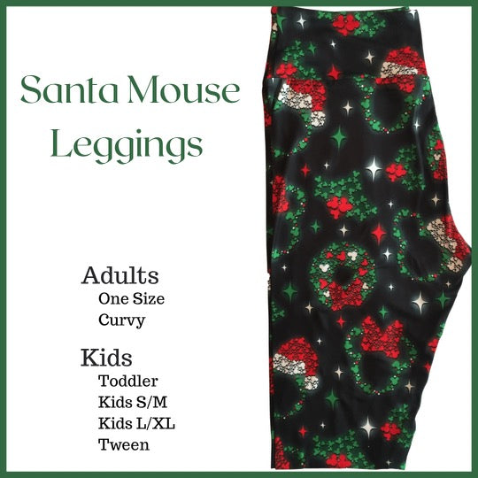 Our super cute black background Santa Mouse leggings are perfect for the holiday season!